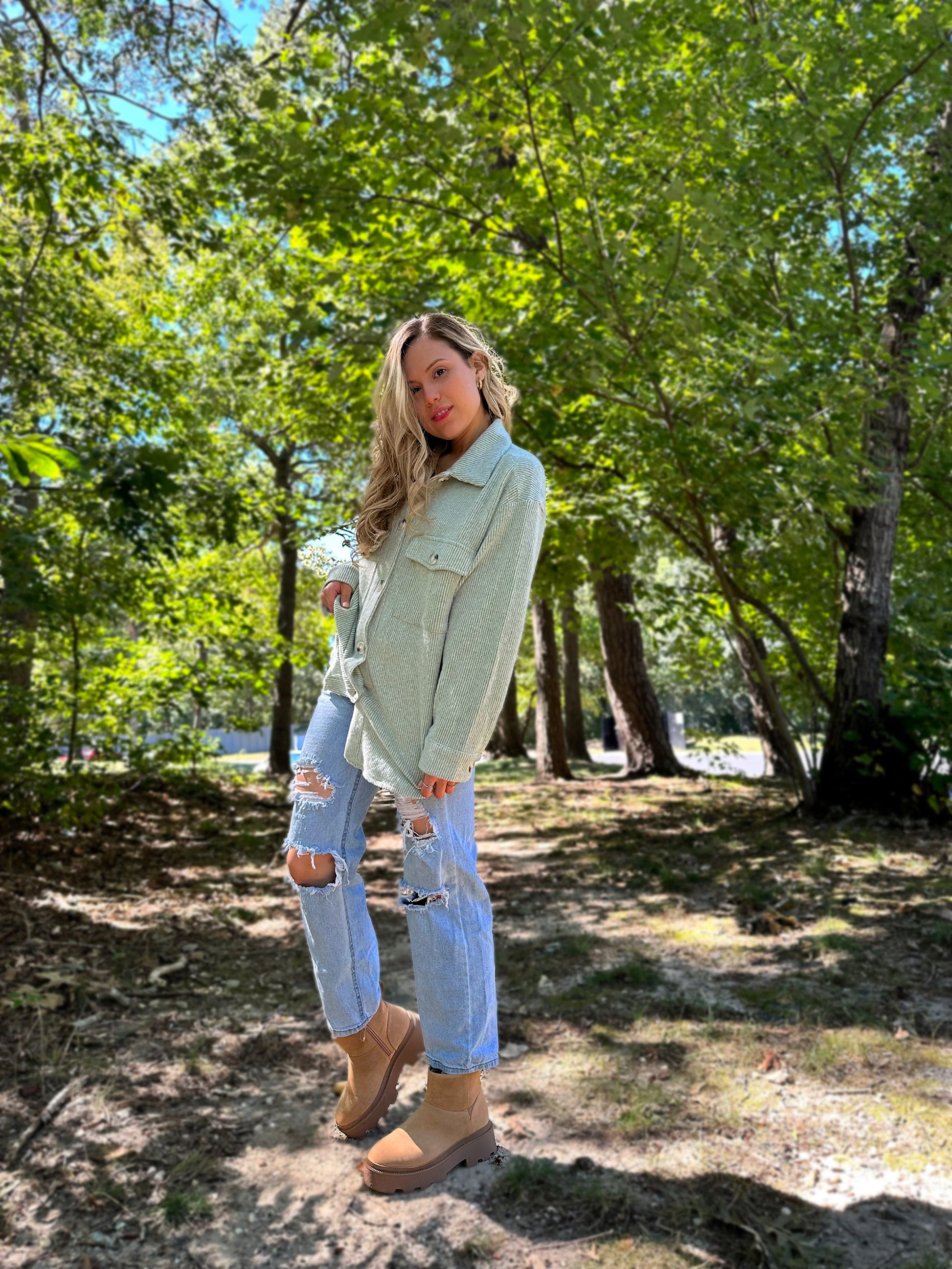 Stylish and cozy ensemble! A long-sleeved, button-down brushed waffle jacket that exudes warmth and sophistication. A front double pocket casual jacket, perfect for on-the-go outings, completes the look.
