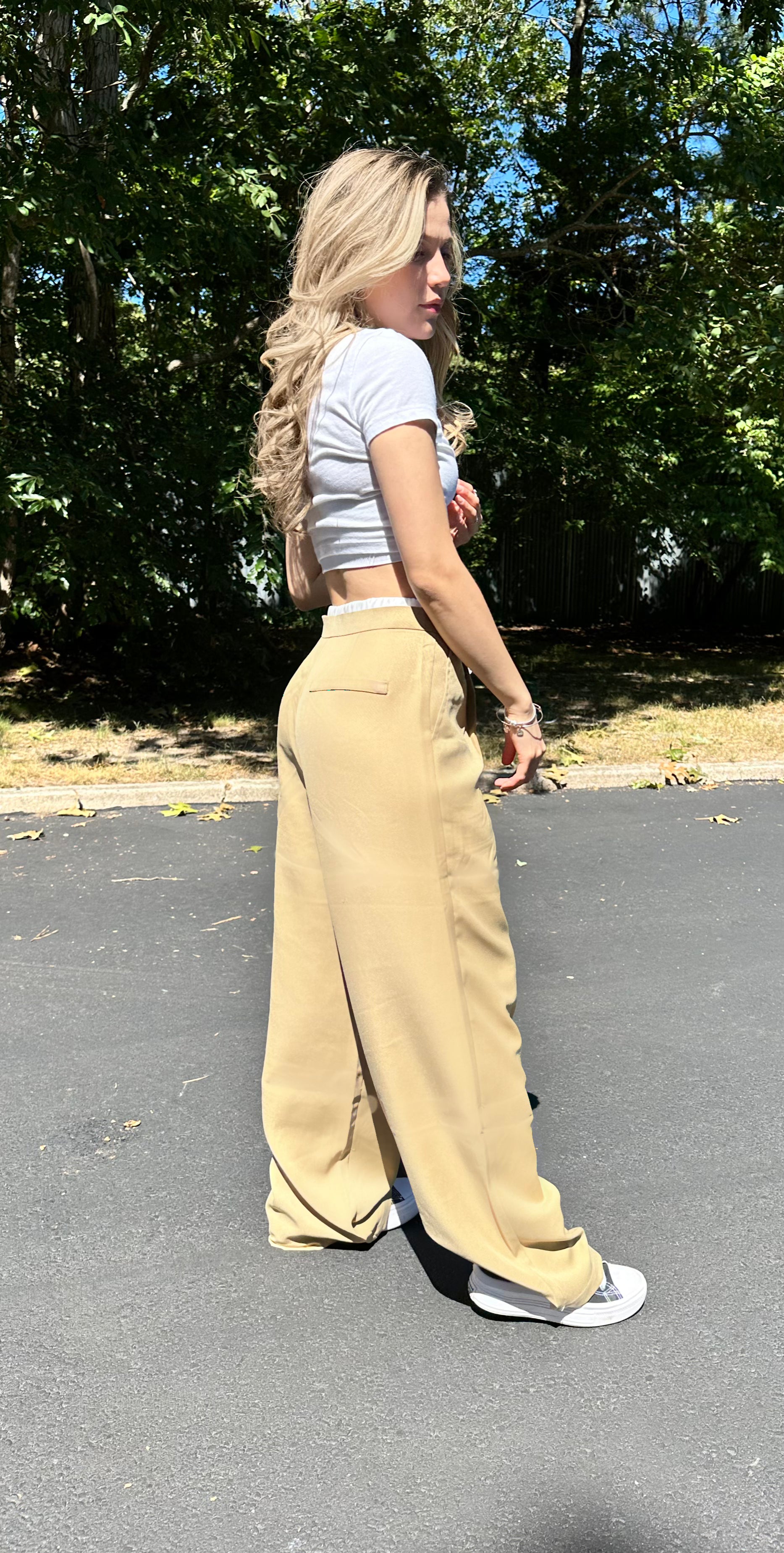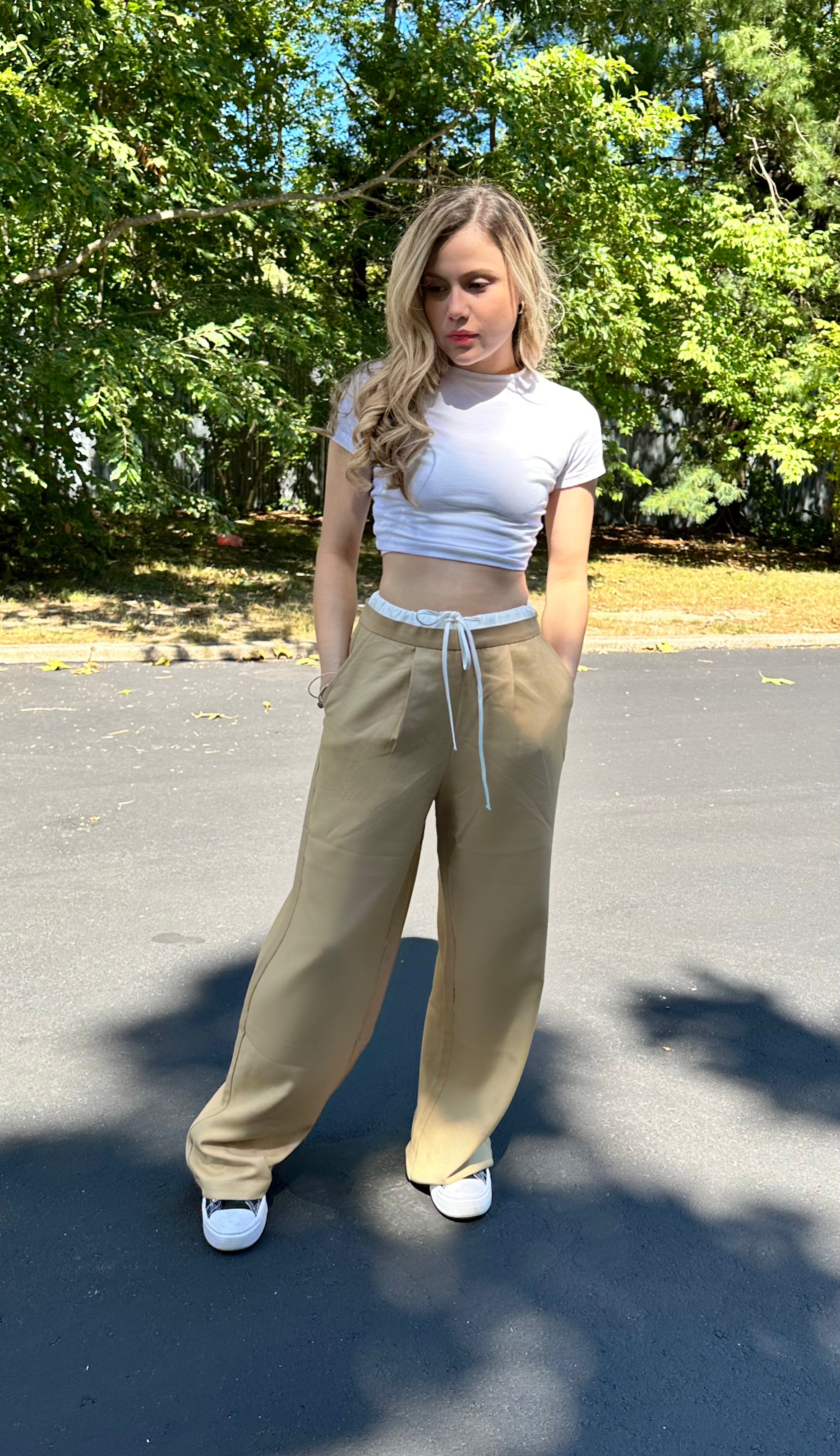 Contrast waist wide leg pants